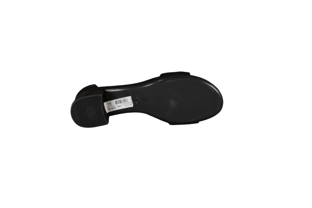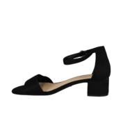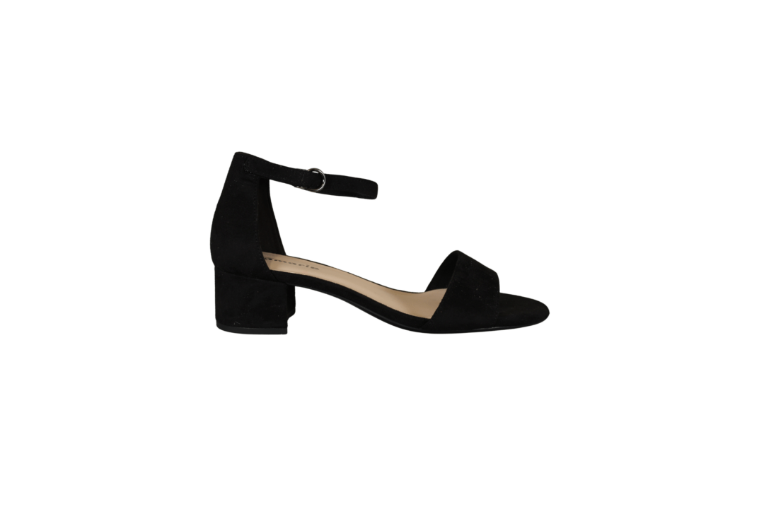 TAMARIS 1-28201-42-001 (421-1572). Pæn let sandal i sort med en ujusterbar rem hen over forfoden. Hælen er 4,5 cm, hvilket er en tilpas højde. Sandalen er lavet i tekstil. Rundt om anklen skal sandalen spændes, og sættes fast med et velcrobånd. Slidsålerne er lavet af gummi. En god sandal til festen eller til daglig dagen.