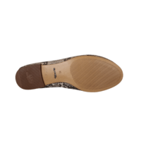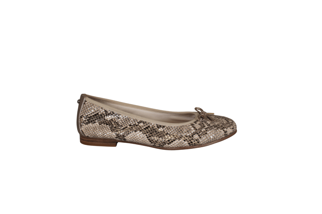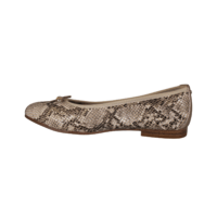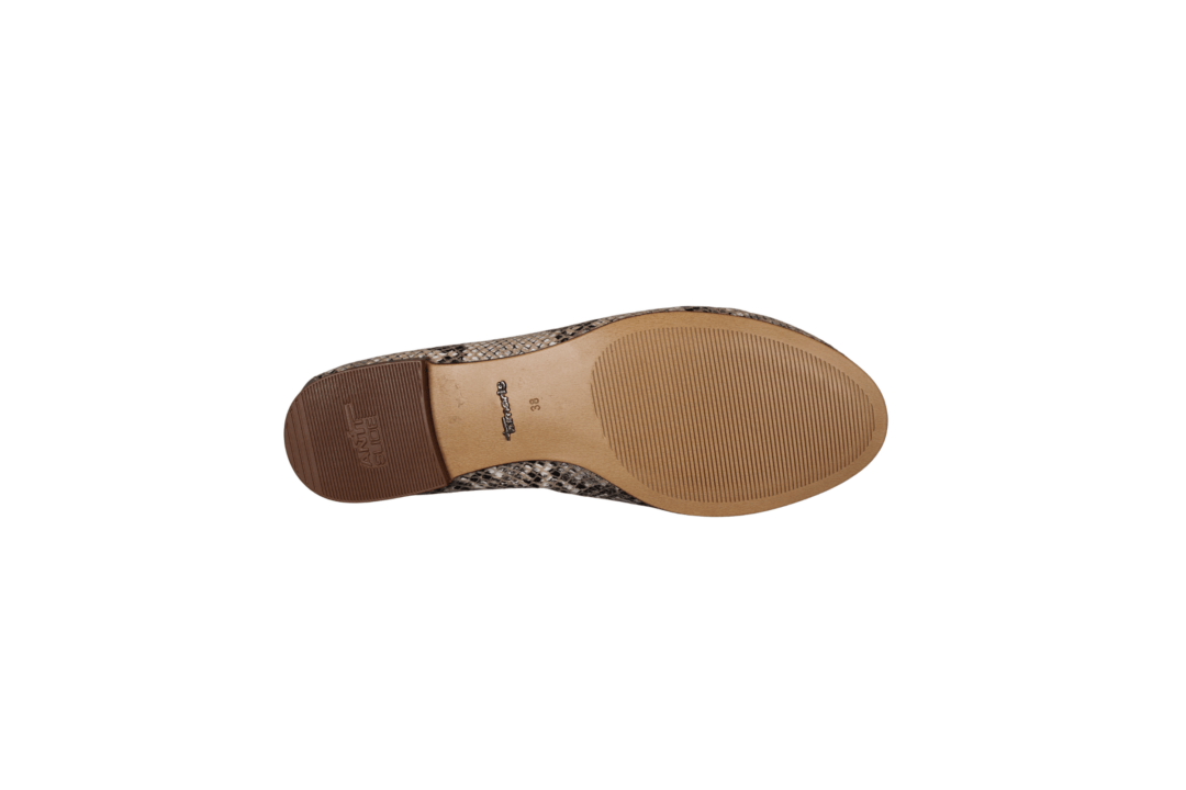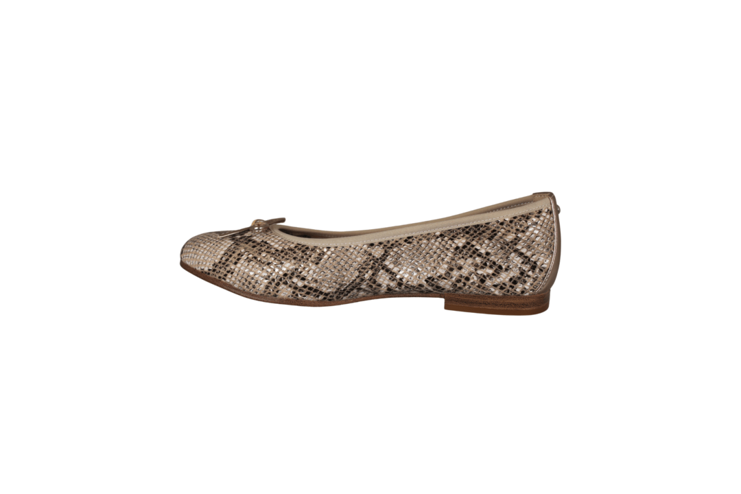 TAMARIS BEIGE SNAKE 22154-46 (221-2151). Fin snake printt ballerina med en lille guld sløjfe på forbladet, samt en guld hæl på hælkappen. Logo sølvl knap på hælen. Elastik rundt i kanten, så skoen sidder godt på foden. Indersålerne er polstret, så skoen er blød at gå med. Ydersålerne er en tynd tunit sål. En fin sko, der vil fikse ethvert sæt tøj op..