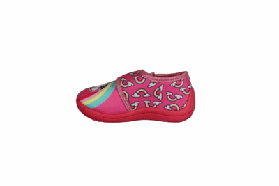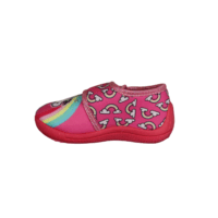 UNICORN MAGIC LE000455 (661-0356). Fin lyserød pige hjemmesko med glimmer rundt i kanten. Enhjørning på for stykket, lys i forstykket. En let hjemmesko med en gummisål, så man står bedre fast. Velcro rem over vristen, nem at komme i.