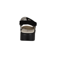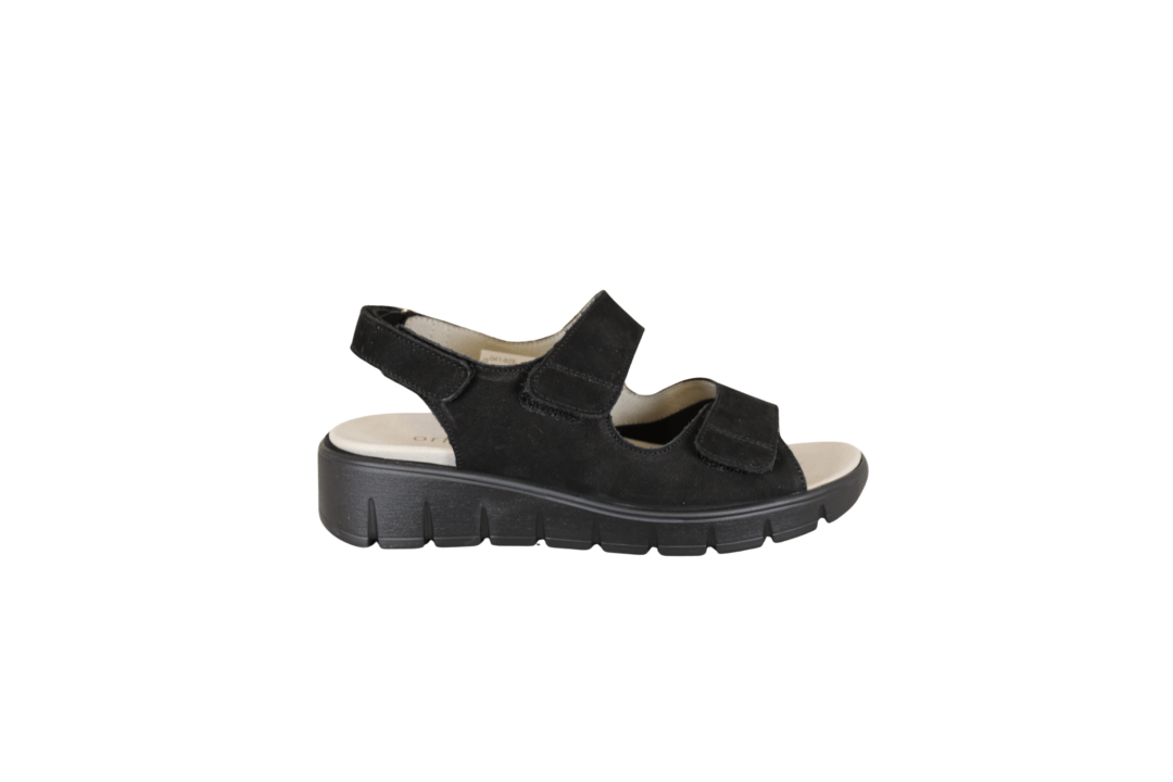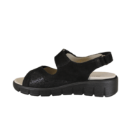 WALDLÄUFER 658K01 206 001 (041-828). Sort praktisk sandal med 3 justerbar velcrobånd – ved hælen, vrist og forfod. Skoen er lavet i skind (nubuck) udvendig, og foret med tekstil indvendig. Sandalen er vidde K. Indvendig sål sidder fast med velcrobånd, og kan udskiftes med evt. egen sål.
