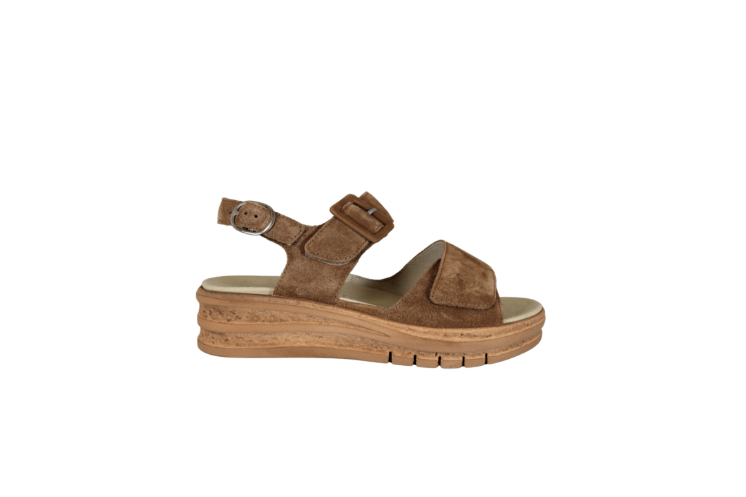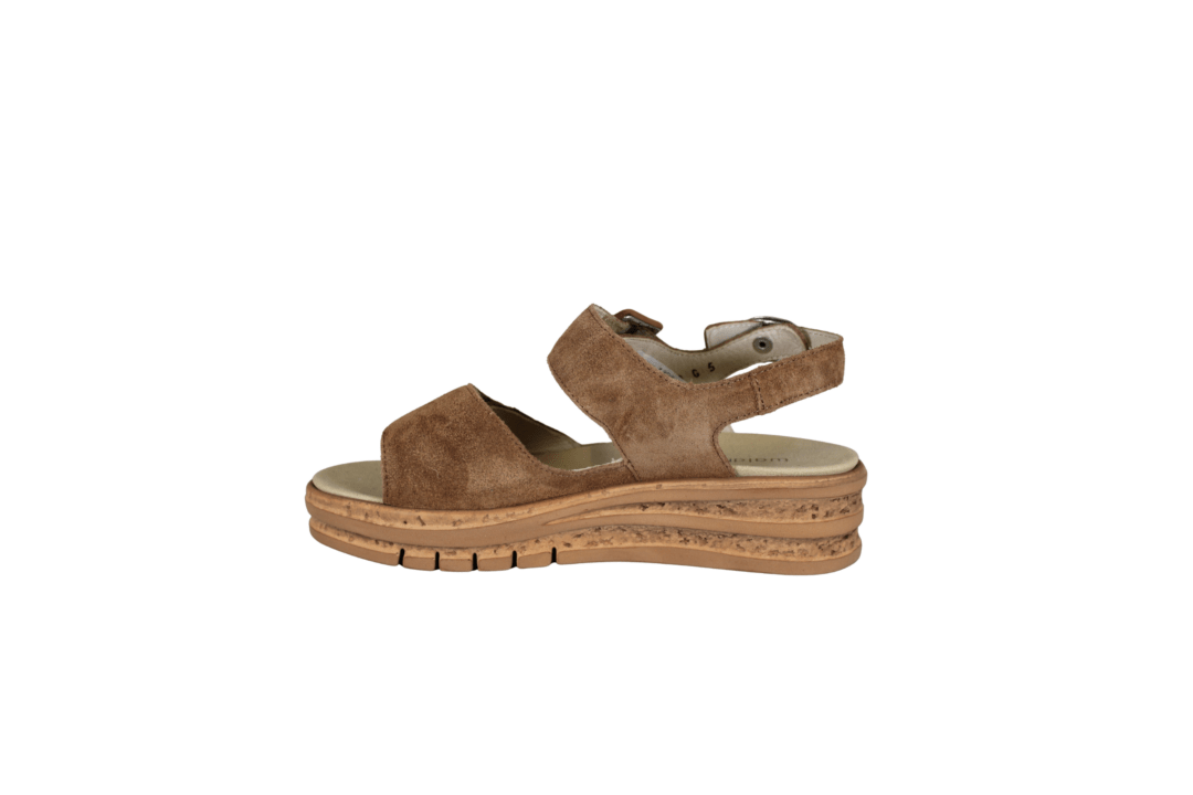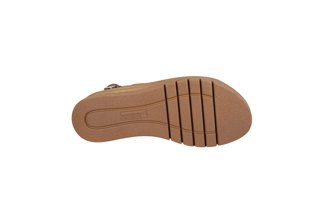 WALDLÄUFER 677001 195 084 LUGINA (041-826). Lys brun ergonomisk sandal med justerbar velcrobånd – hen over foden er der 2 bredde. Rundt i hælkappen er der en spænde. Sandalen er i skind både ind- og udvendig, som giver en god blødhed for foden. Sålen indvendig sidder fast med velcrobånd, men kan skiftes med egen sål.