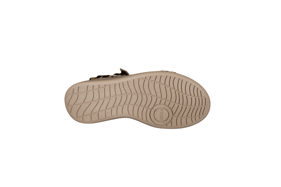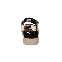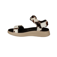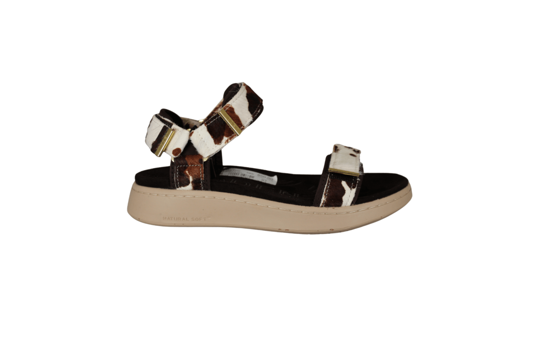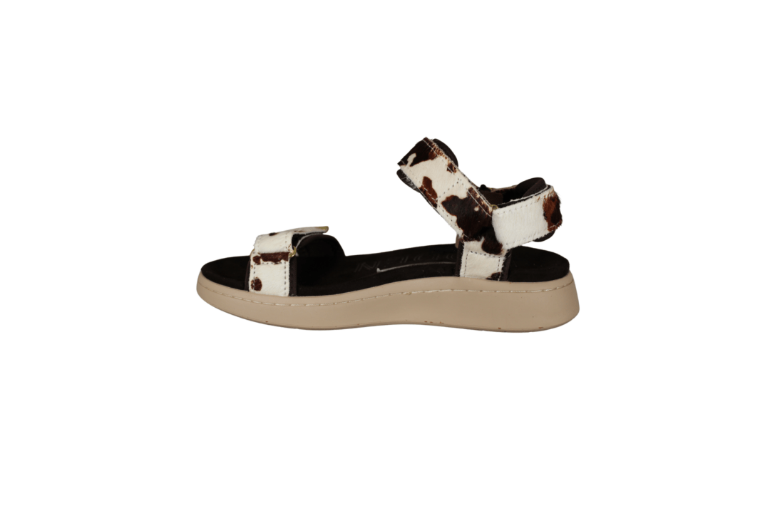 WODEN LINE ANIMAL WL673-357 COW ANIMAL PRINT (425-1234). WODEN sandal i ko print og de lækreste bløde såler. Foden ligger godt nede i en fodskål ved gang. Sandalen har 3 justerbar remme, som kan justeres godt til foden. Materialet er lavet i tekstil. Smart detalje med guld på velcro remmene. En god sandal til hverdag og fest.