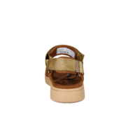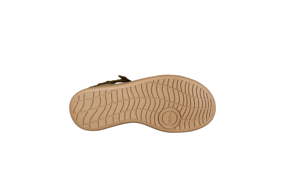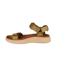 WODEN LINE KHAKI WL926-703 (425-1250). Smart khaki farvet sandal med beige sål, tre velcro remme, som kan reguleres efter foden, med guld afslutninger på remmene. Foden ligger i en fodskål, så foden hviler godt i sandalen. Sålerne er lavet af genbrugs materiale. En god sandal til hverdag og fest.