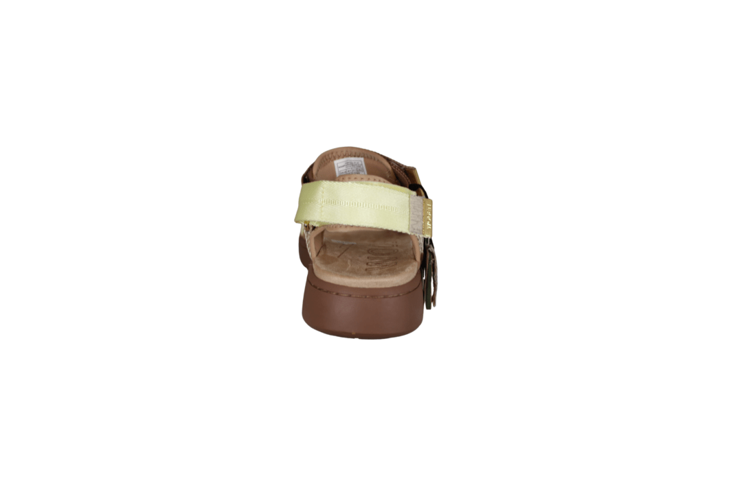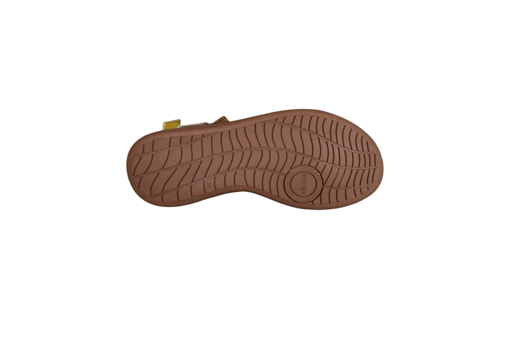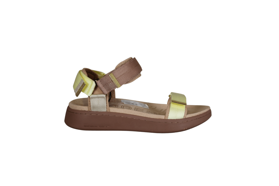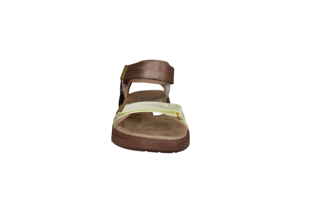 WODEN LINE TRICOLOR WL689-381 TAUPE MULTI (425-1235). WODEN sandal i en lys taupe farve med gule detaljer og de lækreste bløde såler. Foden ligger godt nede i en fodskål ved gang. Sandalen har 3 justerbar remme, som kan justeres godt til foden. Materialet er lavet i tekstil. Smart detalje med guld på velcro remmene. En god sandal til hverdag og fest.