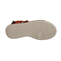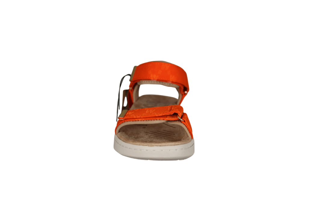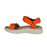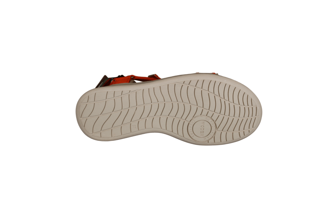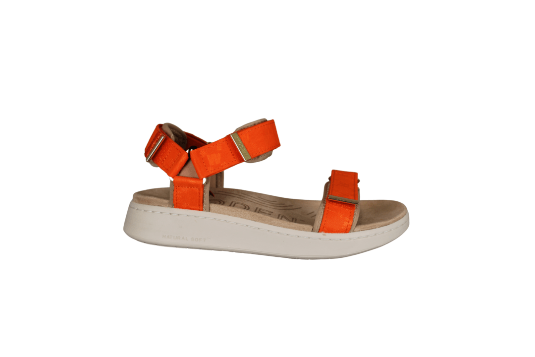 WODEN LINE WL690-903 TIGER (425-1251). Smart helt orange og beige farvet sål. Sandalen har tre justerbar velcro remme, som kan reguleres efter foden. Foden ligger i en fodskål, så foden hviler godt i sandalen. Sålerne er lavet af genbrugs materiale, fiskeskind. En god sandal til hverdag og fest.